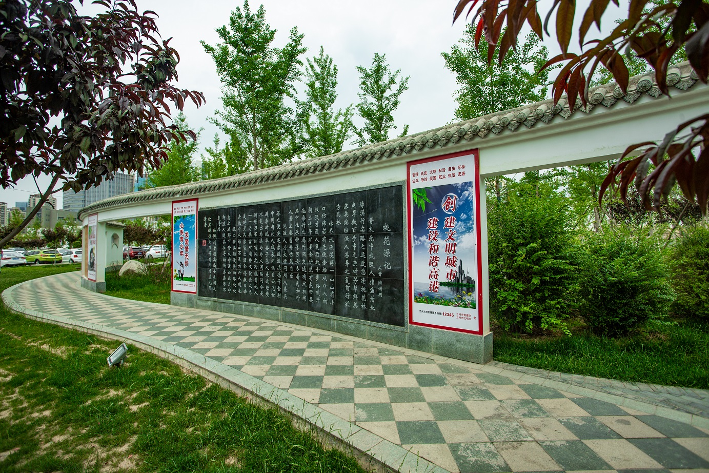 由我公司于2017年06月03日開(kāi)工建設(shè),主要施工項(xiàng)目包括園路、廣場(chǎng)、景墻、